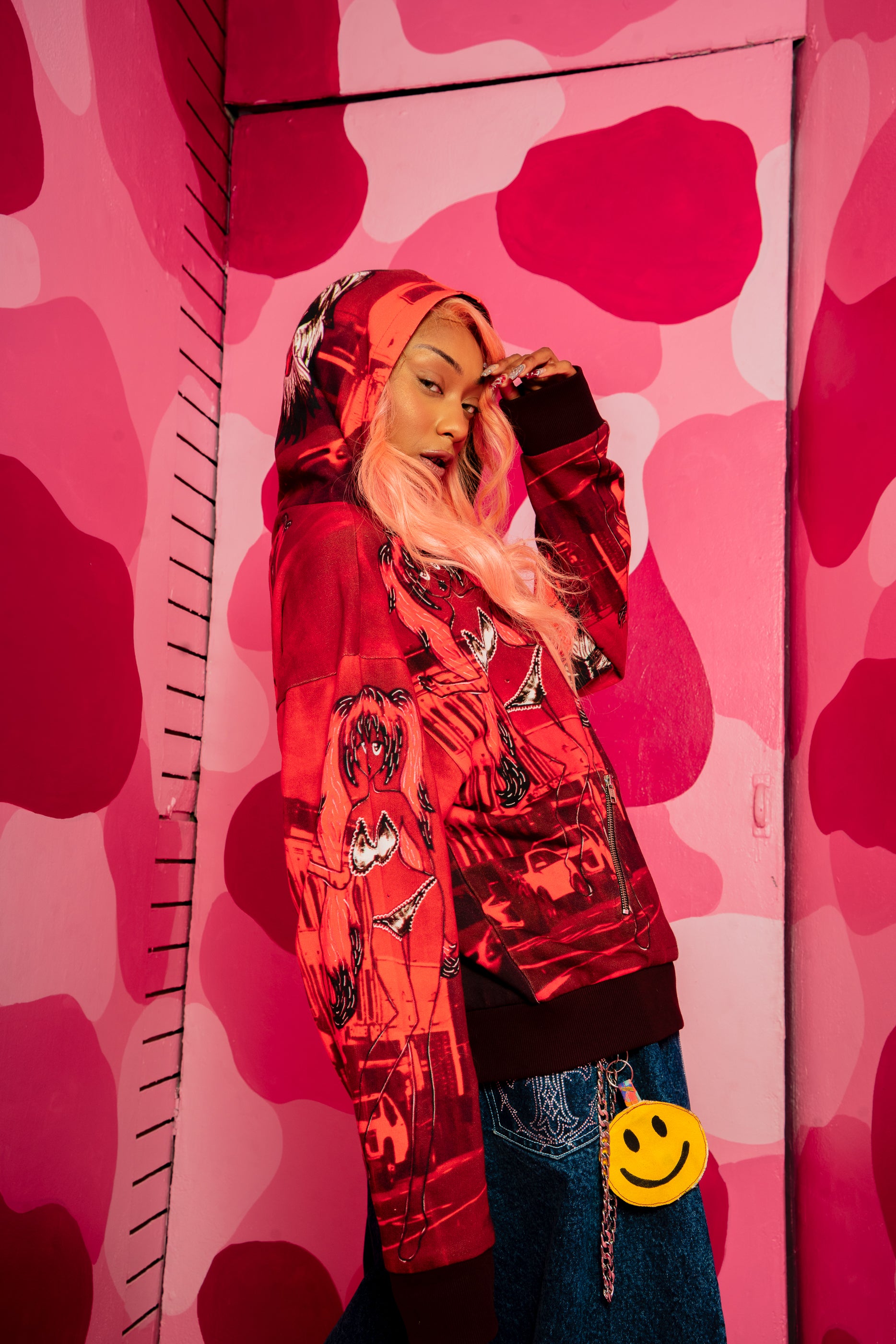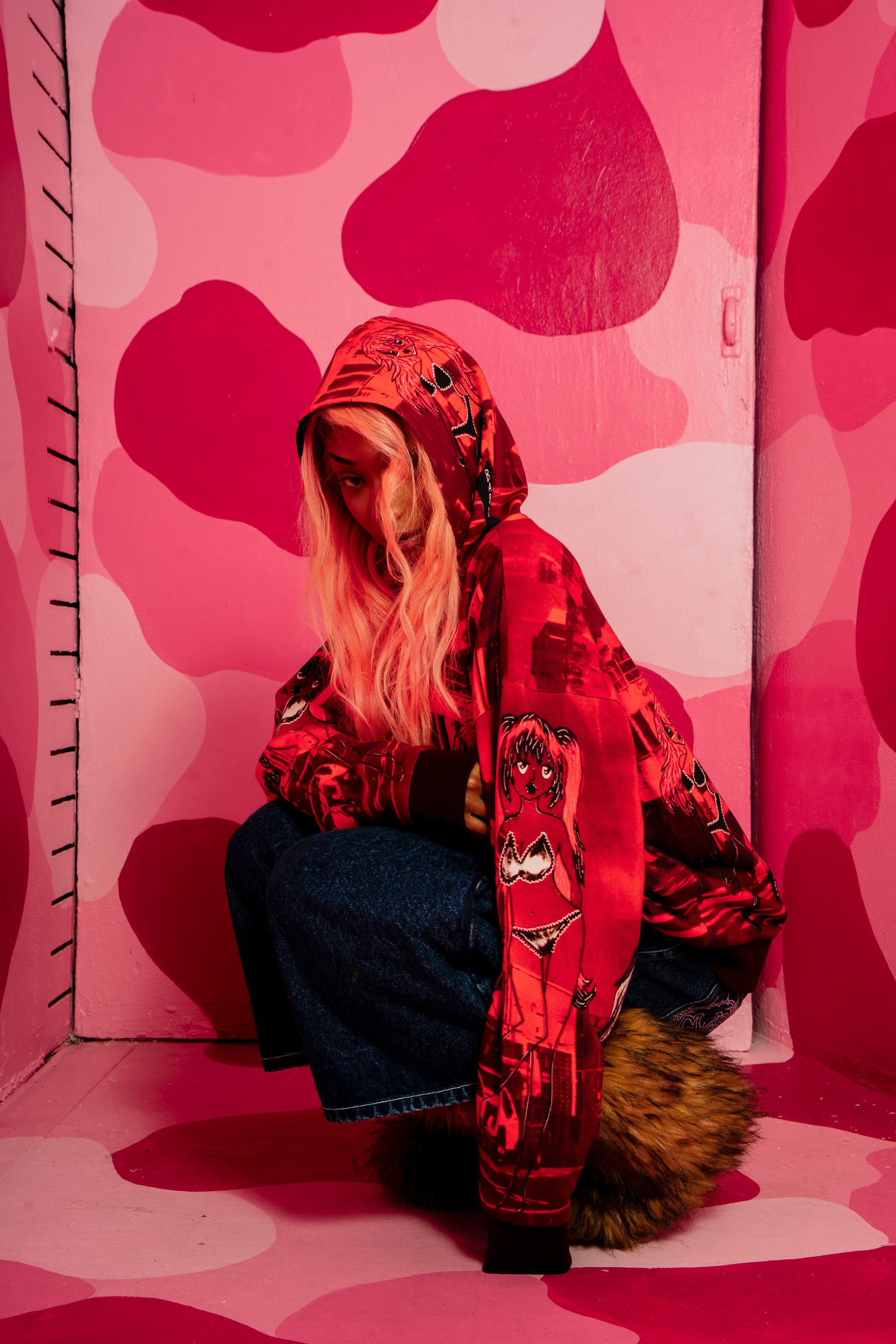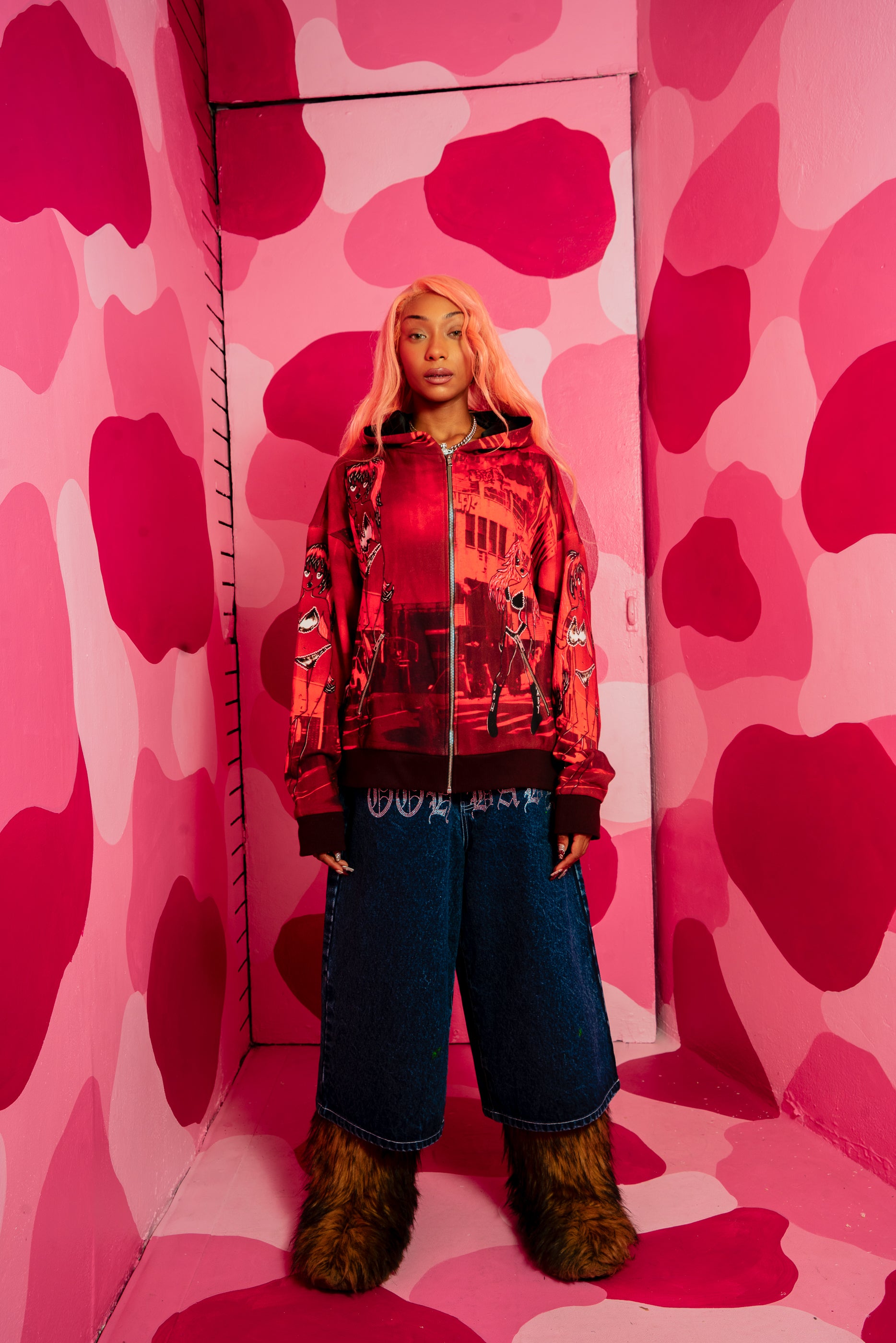 This cotton zip-up features an allover print sourced directly from an original Ooh Baby painting, transformed into a limited run wearable piece. Fully lined with smooth satin for a soft, elevated finish.