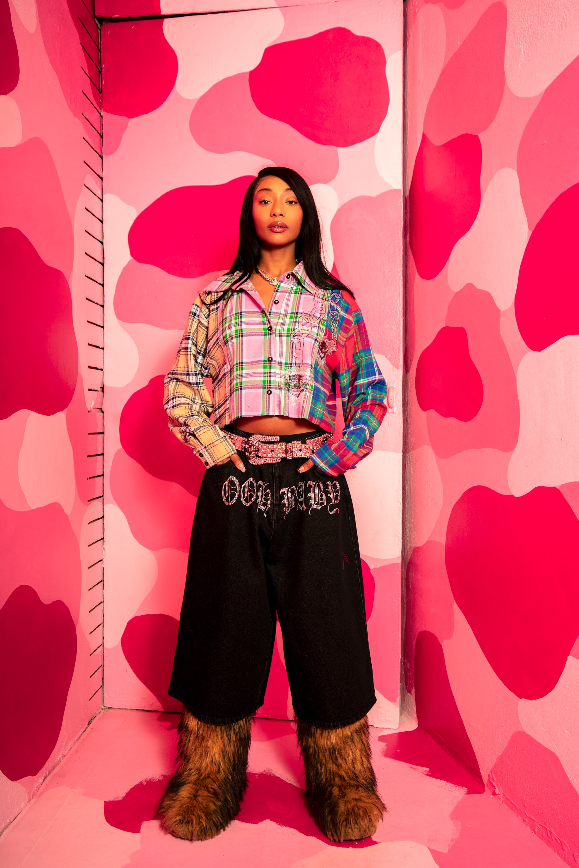 Statement flannel featuring three different flannel fabrics combined into one piece and finished with rhinestone character detailing. Each shirt has its own unique layout due to the mixed-fabric construction.