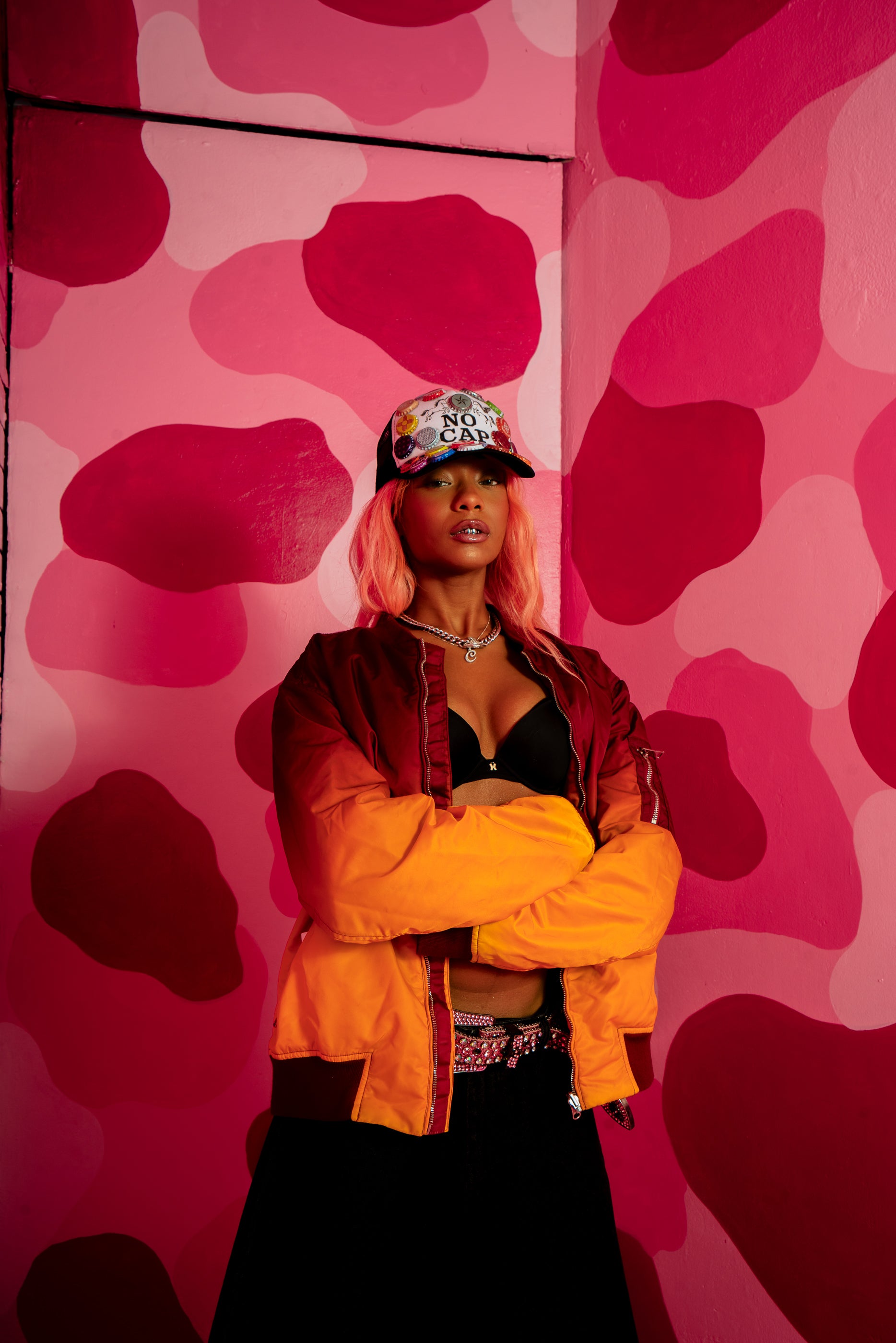 This lightweight spring bomber jacket features a maroon-to-orange ombré fade, ribbed trim, and zippered front and sleeve pockets for functional flair. Finished with a signature Ooh Baby printed lining featuring original artwork, it’s the perfect mix of statement style and everyday utility.