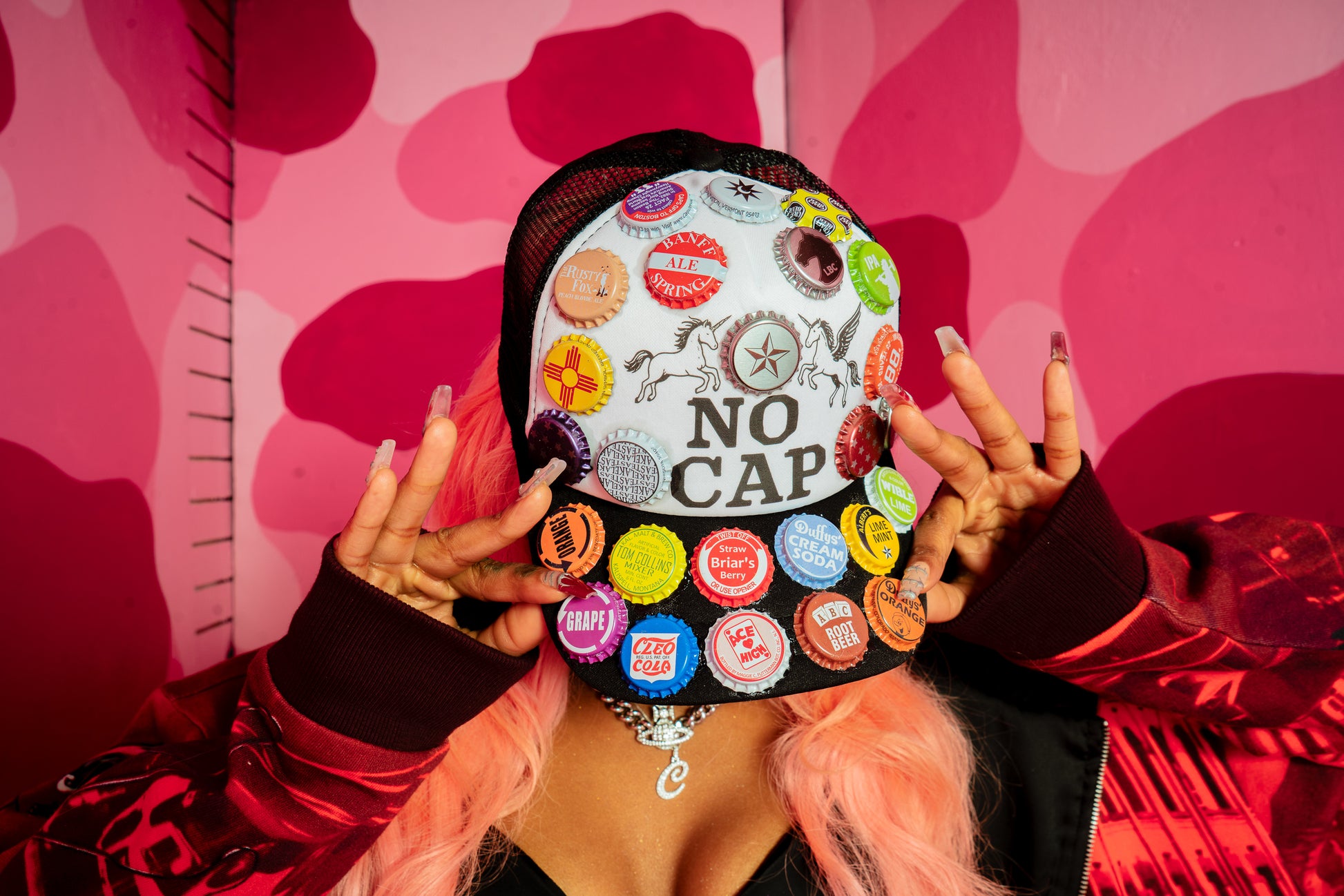 Trucker hat printed in Brooklyn and customized by Anika with hand-applied bottle caps. Each hat has its own unique layout and detailing.