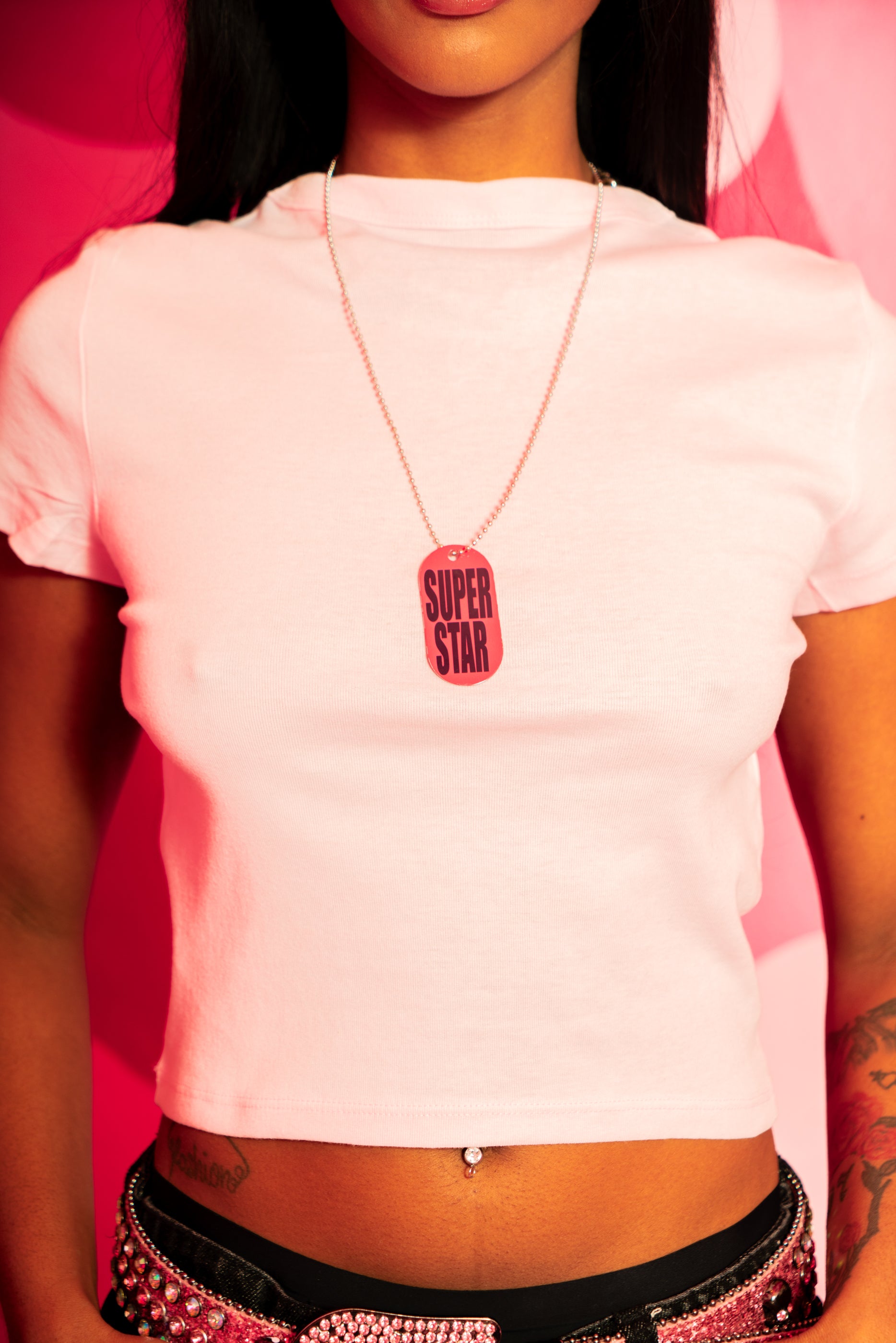 Double-sided metal dog tag featuring a hand-printed horse graphic on the front and the words “Super Star” printed on the back. Each piece is printed individually, making every tag slightly unique.