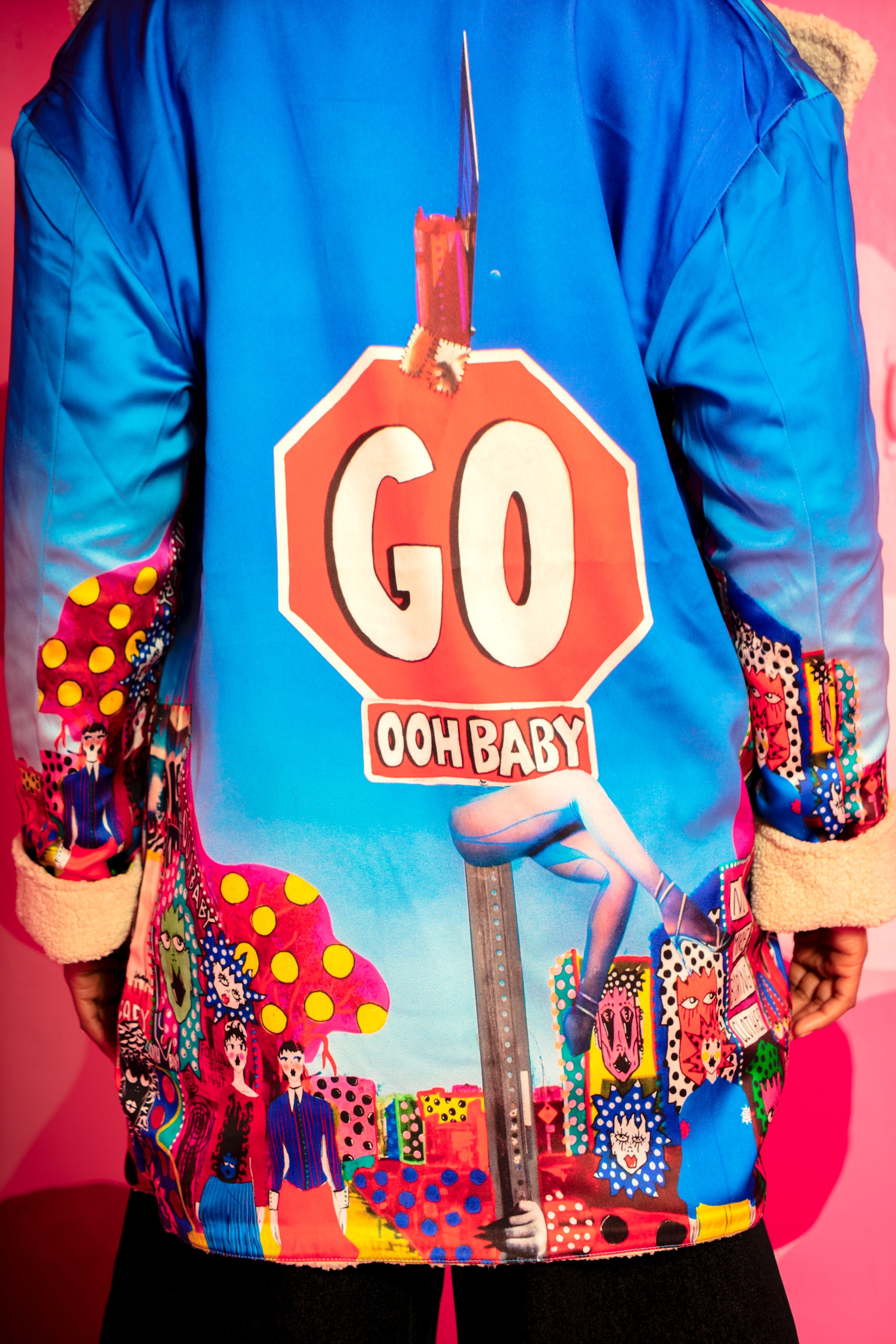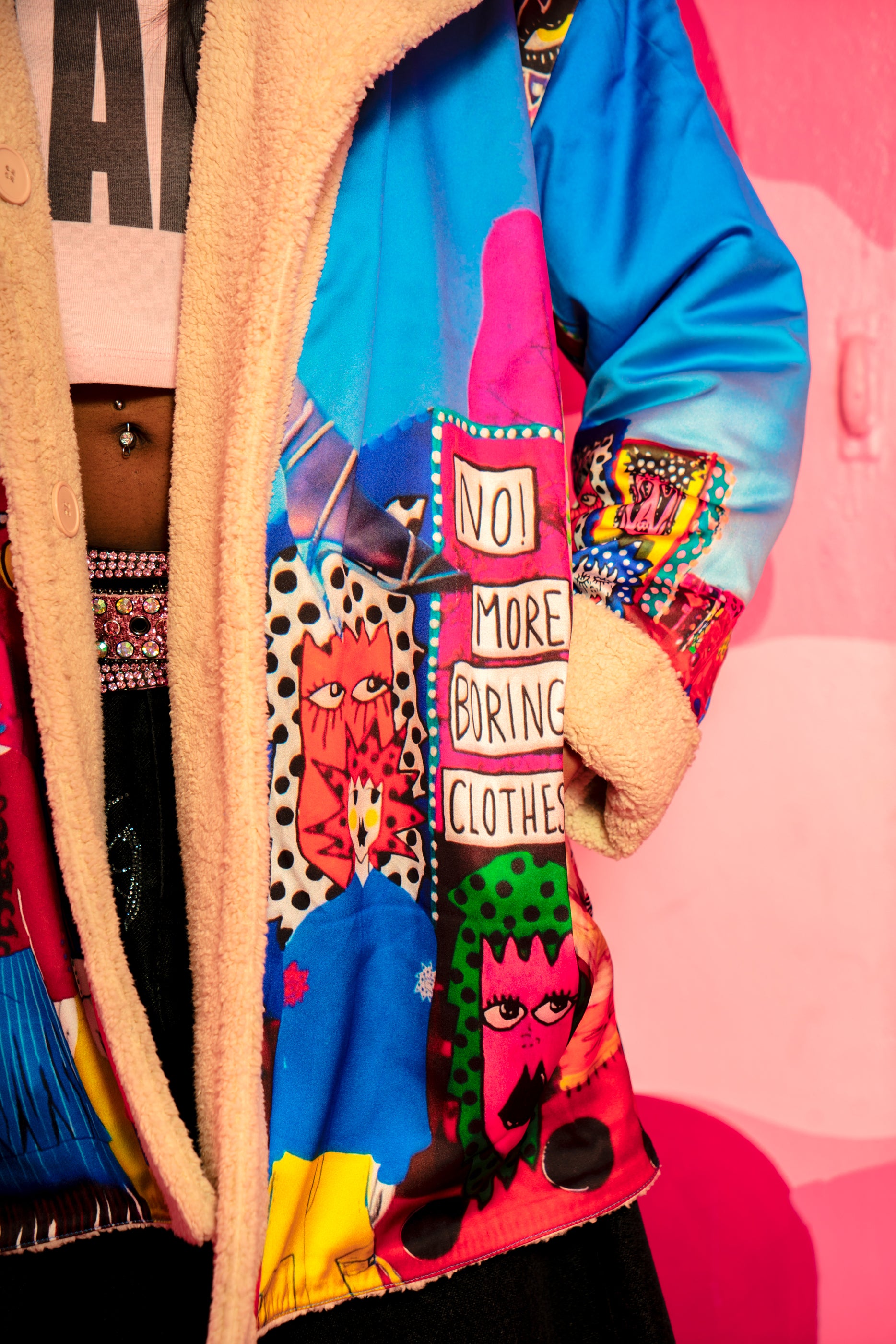 Reversible Sherpa jacket featuring a printed lining of Anika’s original artwork. Designed with fully functional pockets on both sides and made from ultra-soft fabric for everyday comfort. Relaxed, oversized fit for easy layering.